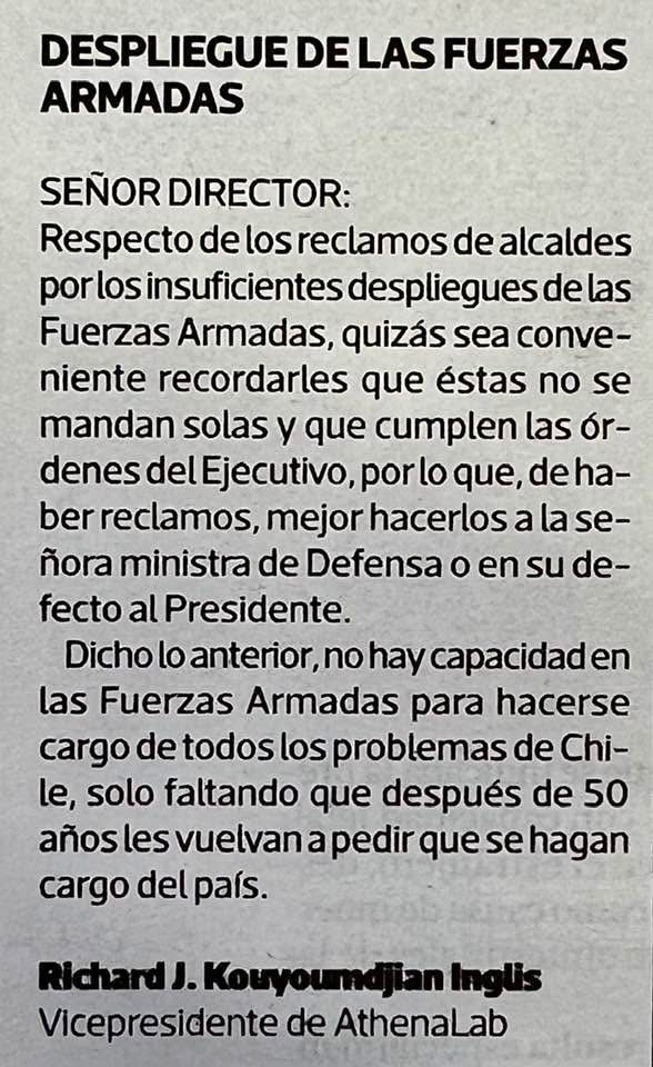 Columna de Opinión News FJDM-C FJDM-C August 27, 2025 August 27, 2025 0 Likes 33 Views 0 Despliegue de las Fuerzas Armadas. Richard J. Kouyoumdjian Las opiniones en esta sección, son de responsabilidad de sus autores y no reflejan necesariamente el pensamiento de la Unión de Oficiales en Retiro de la Defensa Nacional