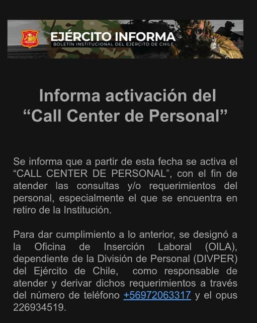 Destacados News U al dia FJDM-C FJDM-C January 30, 2026 January 30, 2026 0 Likes 17 Views 0 Informa activación de Call Center de Personal. Ejército de Chile
