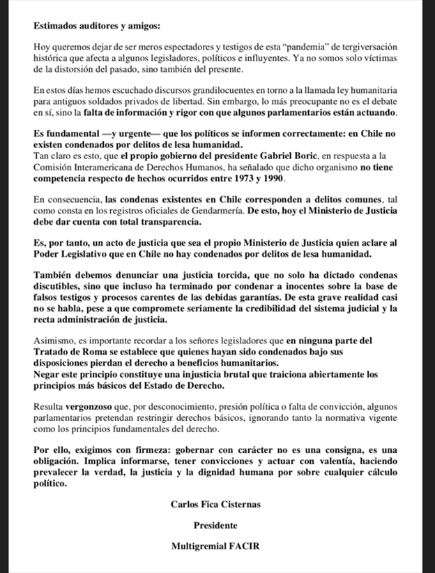 Que Chile conozca la verdad. Carlos Fica Cisternas Presidente Multigremial FACIR